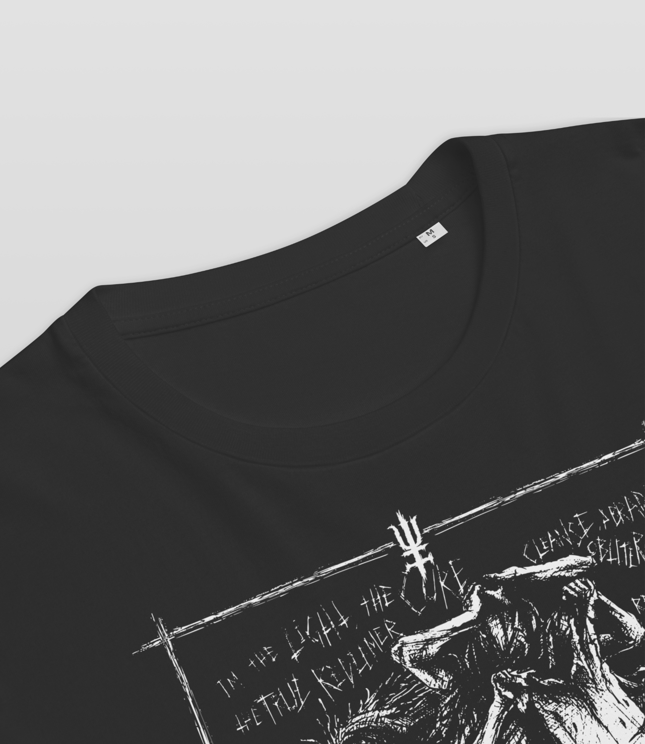 This unisex T-shirt features a black and white illustration for the song Insanity printed on the front. It is made from organic cotton and constructed with set-in sleeves, a ribbed collar, and double-needle stitching at the hems for a clean, durable finish. The fabric is OEKO-TEX® Standard 100 certified.