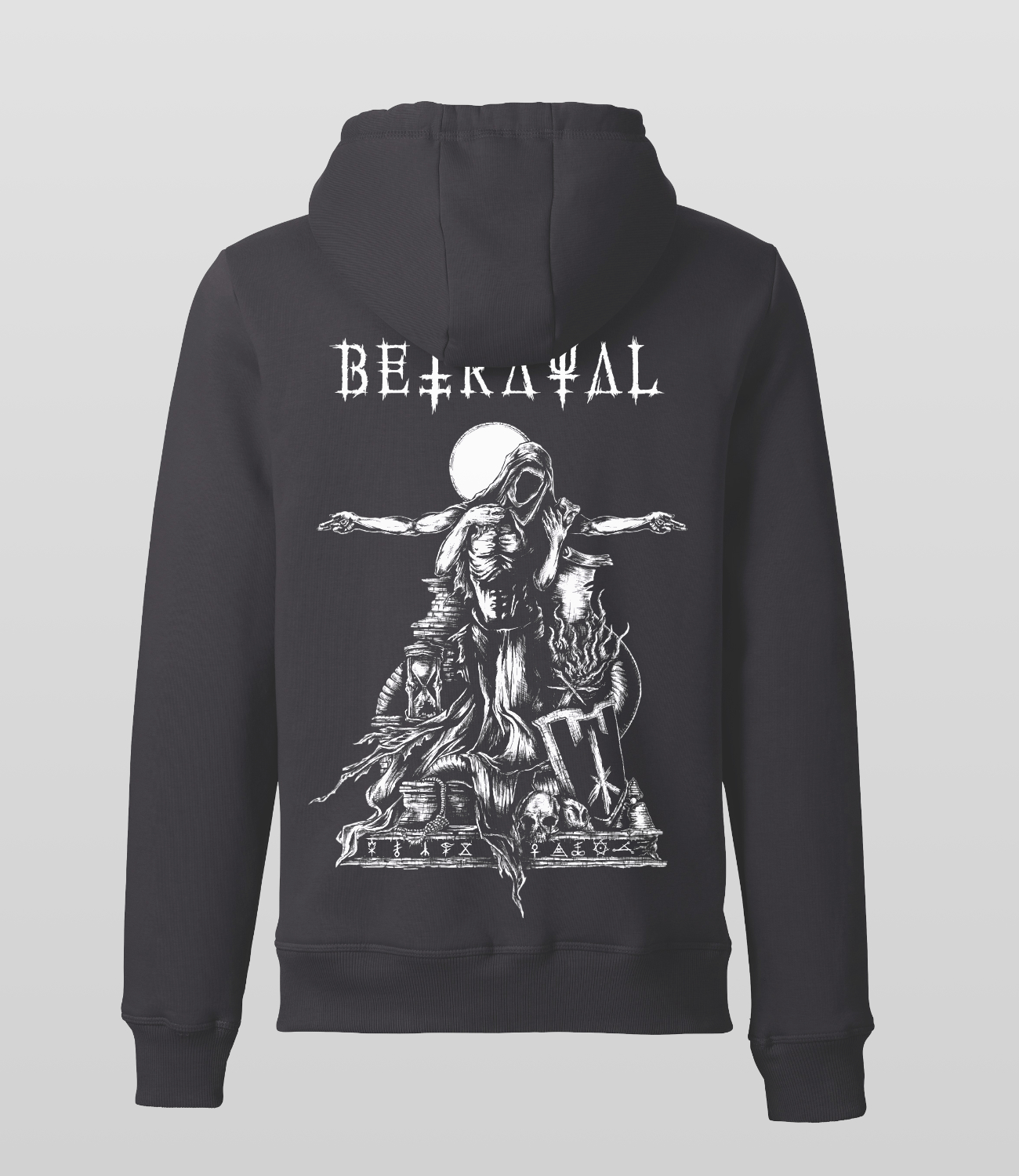 This zip hoodie features the Disorder Remains artwork screen printed on the back and an embroidered Betrayal symbol on the chest. It is constructed with a high collar, a full-length front zipper, and set-in sleeves. Side seam kangaroo pockets and ribbed cuffs provide a clean, functional finish.