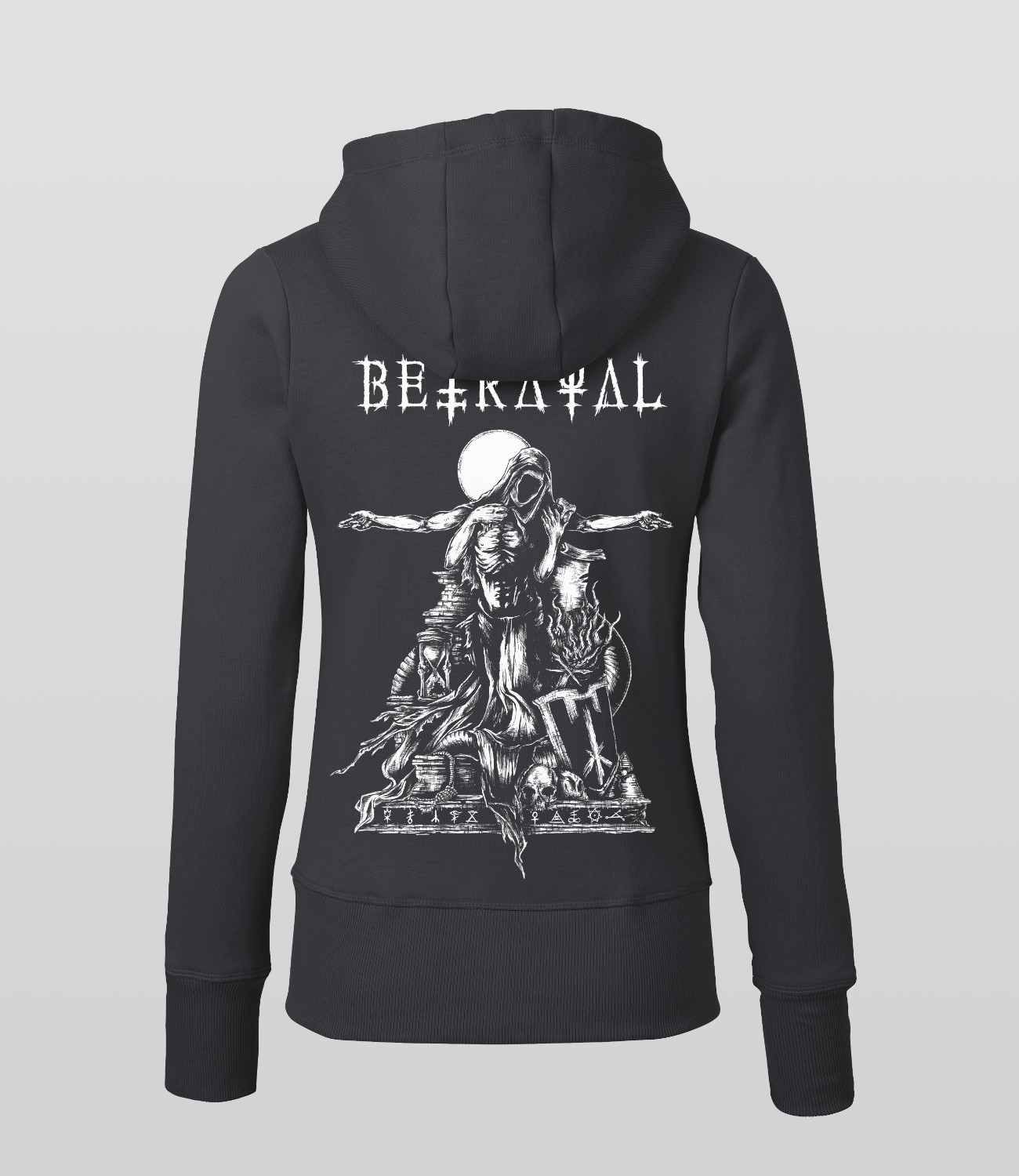 This zip hoodie features the Disorder Remains artwork screen printed on the back and an embroidered Betrayal symbol on the chest. It is constructed with a high collar, a full-length front zipper, and set-in sleeves. Side seam kangaroo pockets and ribbed cuffs provide a clean, functional finish.
